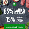 Lamb, Beef Liver, Beef Kidney, Beef Spleen, Carrots, Apples, Sweet Potatoes, Butternut Squash, Montmorillonite Clay, Ground Miscanthus Grass, Ground Flaxseed, Tricalcium Phosphate, Salmon Oil, Vitamins (Vitamin E Supplement, Thiamine Mononitrate, Vitamin D3 Supplement), Salt, Potassium Chloride, Minerals (Zinc Proteinate, Copper Proteinate, Manganese Proteinate, Calcium Iodate), Blueberries, Spinach.